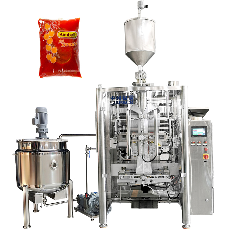 Medición automática del volumen, fabricación de bolsas, llenado, sellado, corte, impresión del número de lote y corte de las muescas de rasgado, transporte del producto terminado. Aplicable para el producto líquido.
