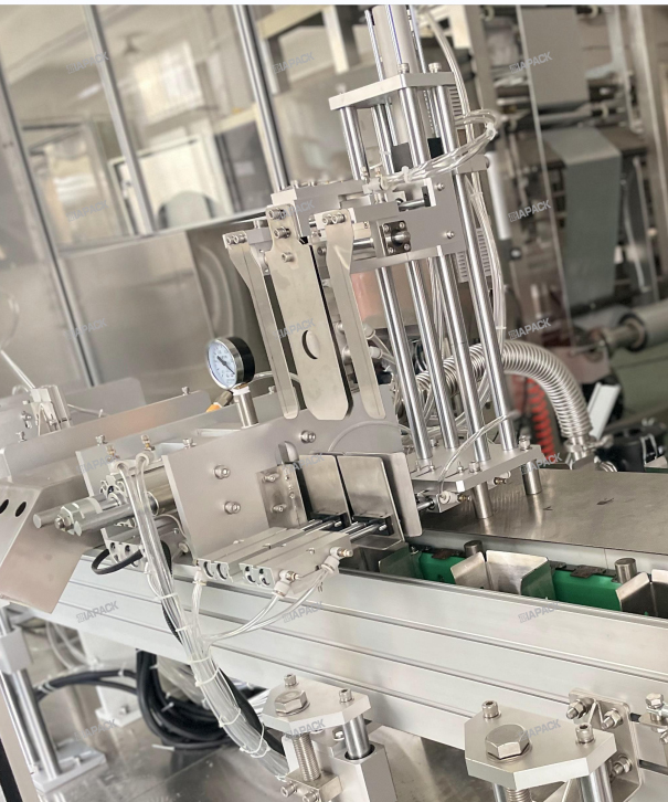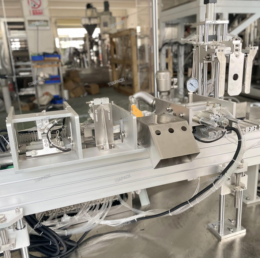 Esta máquina tiene un diseño especial para hacer la bolsa de escudete con etiquetado superior. Después de que la bolsa llena con el producto caiga en esta máquina. Esta máquina llevará la bolsa, la doblará por la boca una vez y luego pegará la etiqueta. SUS304. El PLC y la pantalla táctil son adoptados por la marca Siemens. Y las piezas neumáticas adoptan la marca SMC. Los componentes eléctricos principales adoptan las marcas Omron y Schneider. Esta máquina funciona con una máquina de envasado automático para alcanzar el etiquetado superior de la bolsa terminada. de la etiqueta separada, envío de etiquetas, detector de etiquetas y prensado de etiquetas.