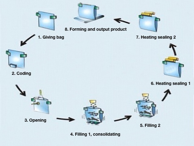 Velocidad 10-35 bolsas/min(La velocidad depende del estado del producto y del peso de llenado)) Peso 1400KGS 1520KGS 1580KGS 1650KGS voltaje 380V trifásico 50HZ/60HZ Poder total 2KW 2.2kw 2.5kw 2.5kw Comprimir aire 0.8m3/min(suministrado por el usuario) 8bar Proceso del producto