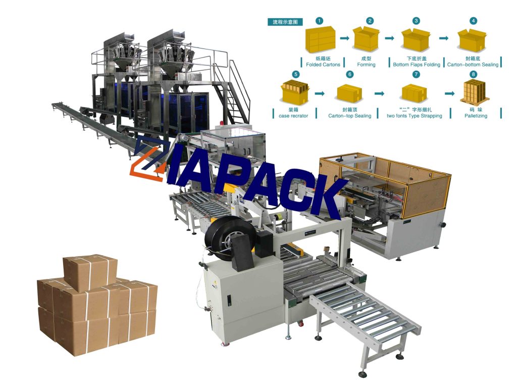 - Puede trabajar con la máquina de envasado de película, el empaquetador de cajas y la máquina de envolver para formar la línea de producción de empaque de final de línea.