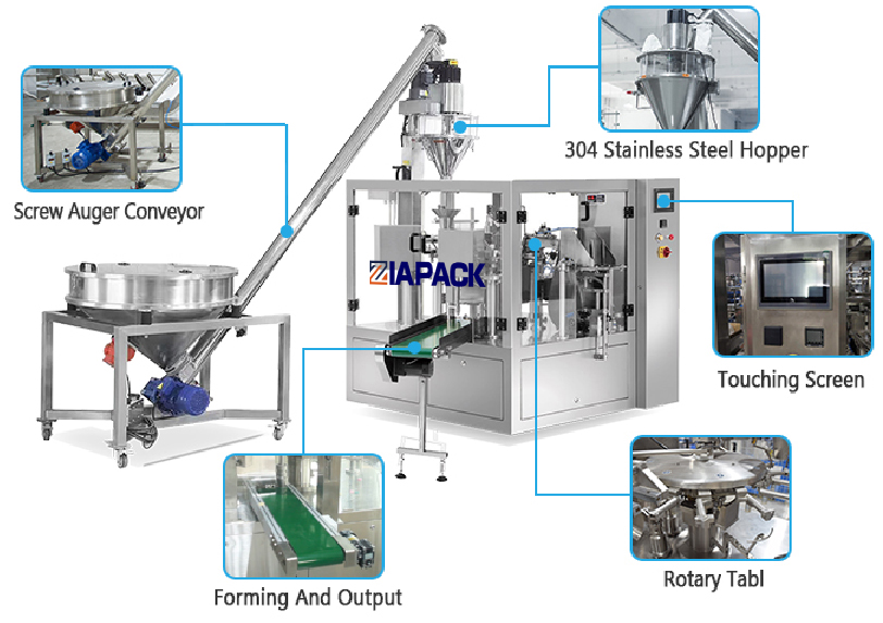 Equipado con Augur Filler y Screw Elevator, se aplica ampliamente al polvo de empaque, como detergente en polvo, leche en polvo, harina, especias, coco en polvo, café molido, etc.